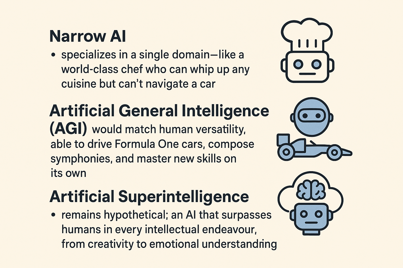 - Artificial General Intelligence (AGI) is like apart from being a super chef, can also drive Formula One cars, compose symphonies, and master new skills on its own.