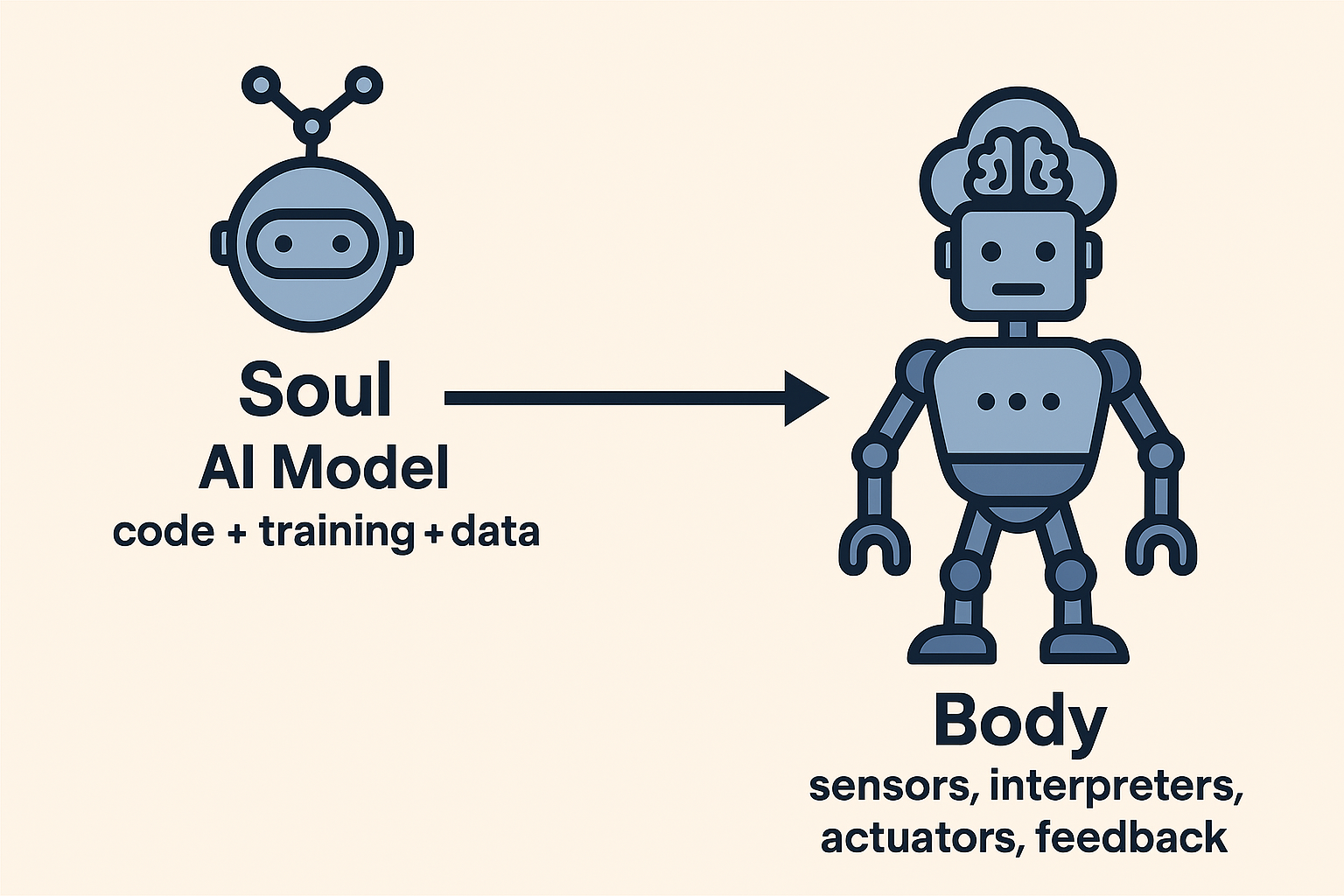 We might think of an AGI’s core architecture – its neural weights, algorithms, and training data -as its “soul.” Meanwhile, robotic systems – comprising sensors, interpreters, manipulators, and adapters – form its “body,” enabling it to sense, interact, and affect the world.